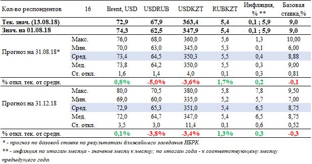 Эксперты так же прогнозируют укрепление рубля относительно доллара США (-5,0%) и некоторого восстановлениея цен на нефть (+0,8%) выше уровня $73 за баррель. При этом ожидается, что тенге несколько ослабеет к российскому рублю (+1,7%) относительно текущих уровней.