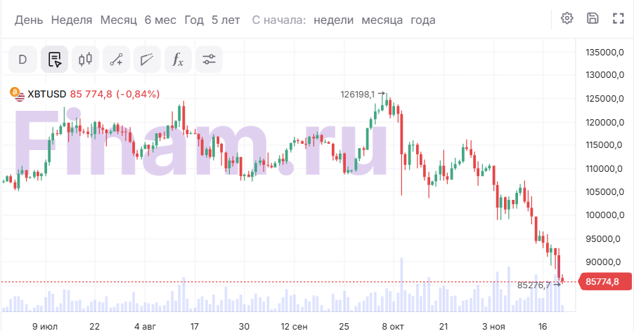 Флагманская цифровая валюта упала до 86325,81 доллара, самого низкого уровня с 21 апреля. В моменте она торгуется ниже 86000.