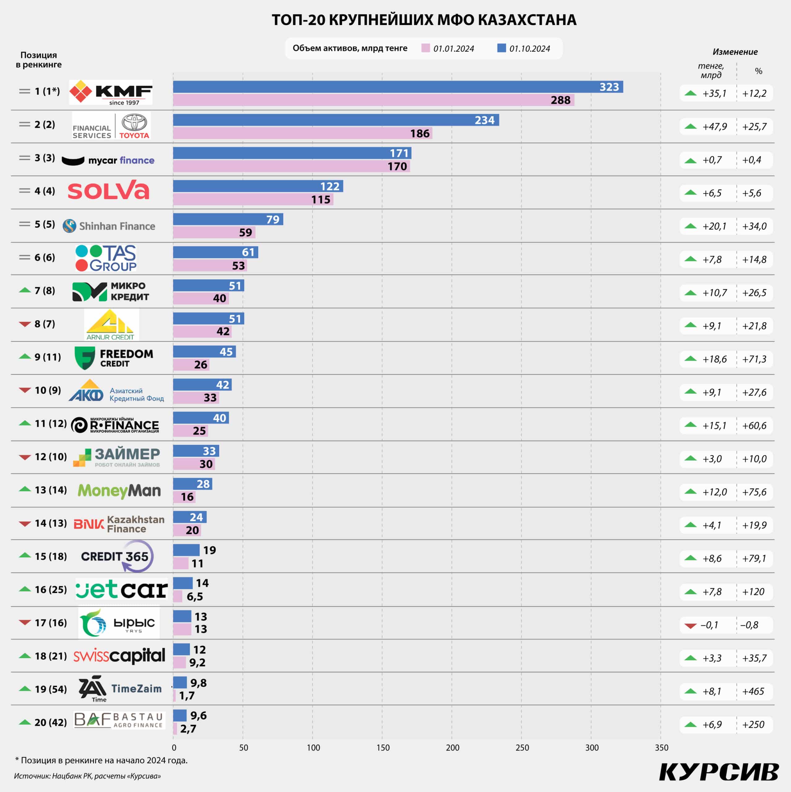 Два других претендента на смену статуса намного опережают «БиЭнКей» по размерам и масштабам бизнеса. Ссудник KMF (№1 по активам) сегодня составляет 278 млрд тенге, и это больше, чем, например, у Нурбанка (261 млрд). АО «ОнлайнКазФинанс» (бренд Solva, №4 в ренкинге крупнейших МФО) располагает кредитным портфелем в 108 млрд тенге, превосходя по этому показателю сразу шесть действующих банков второго уровня. По данным портала LS со ссылкой на АРРФР, документы на конвертацию в банк, поданные KMF и Solva, все еще находятся на рассмотрении регулятора. Как отметили в АРРФР, «по закону обращение о выдаче разрешения на конвертацию МФО в БВУ должно быть рассмотрено уполномоченным органом в течение 65 рабочих дней со дня подачи документов».