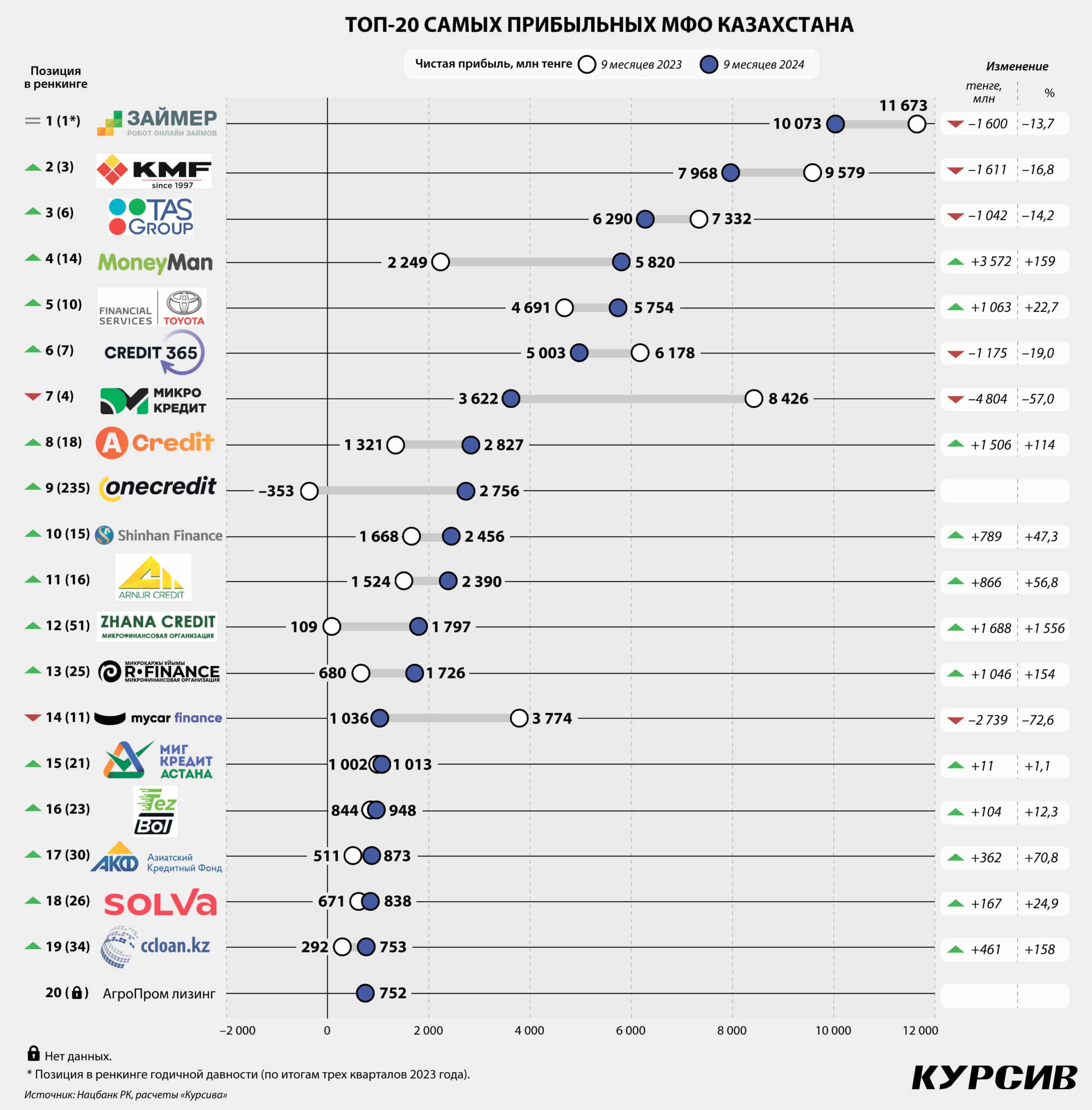 В разрезе отдельных игроков худшую динамику прибыли показала компания Lending and Finance technologies (–4,8 млрд тенге относительно результата прошлого года). У MyCar Finance чистый доход сократился на 2,7 млрд тенге. Еще у четырех компаний финансовый результат ухудшился более чем на 1 млрд тенге: KMF (–1,6 млрд), «Робокэш.кз» (–1,6 млрд), Credit365 (–1,2 млрд), TAS Finance (–1,0 млрд). При этом «Робокэш.кз» (известна по бренду «Займер») продолжает оставаться самой прибыльной компанией в секторе (топ-10 лидеров данного ренкинга изображены на инфографике).